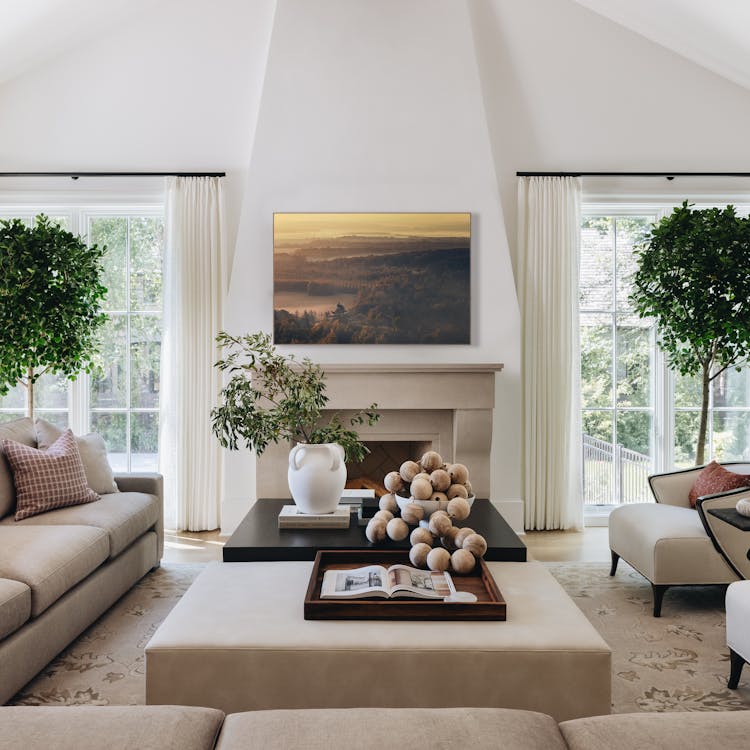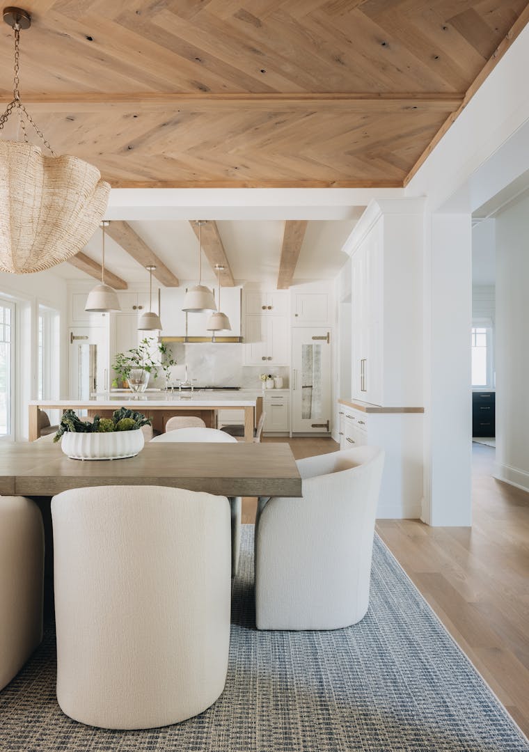 The interior design is unfussy, with bright, voluminous, simply designed spaces and subtle applications to ceilings. Starting with a blank canvas allows thoughtful use of pattern and color to pop.