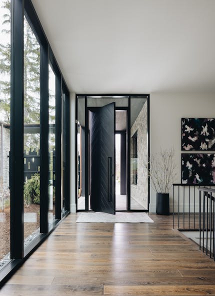 Heavily influenced by this homeowner’s commercial construction background, the interior architecture draws in exterior features with floor to ceiling window systems and lift-and-slide doors that open the whole house to a covered, back patio built for entertaining.
