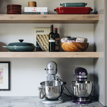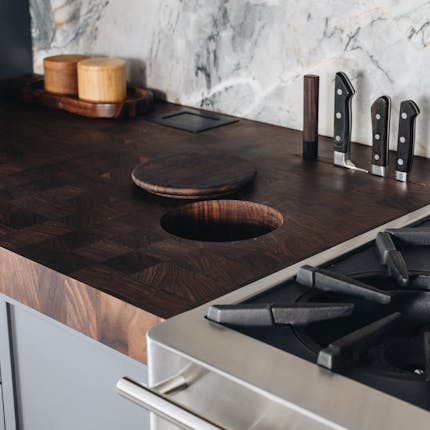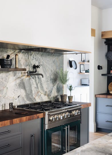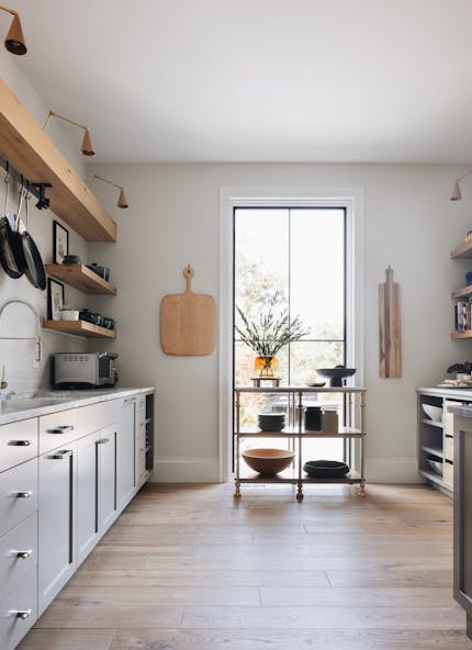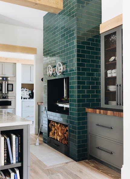Their design inspiration included Scottish golf courses, Blackberry Farm, and traditional open-hearth cooking. Here, the kitchen is the heart of the home, and its workhorse, outfitted with a wood-burning oven, dining room slash cocktail bar, and a prep kitchen.