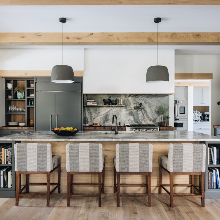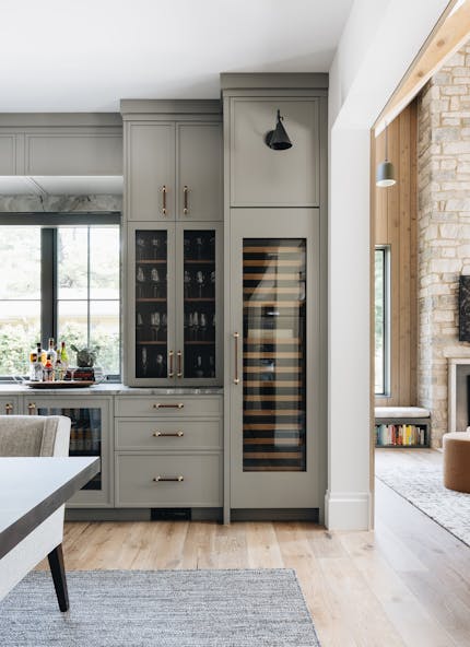 Each distinctive space is finished in earthy hues and materials, personalized with the couple’s curated art collection, and thoughtful details–like wall niches for your drink when it’s your turn at shuffleboard and kitchen details to satisfy a chef.