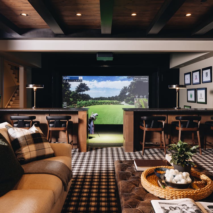 They take play seriously. A golf simulator is the star of the Scottish-pub-themed basement, complete with plaid carpeting, shuffleboard table, and plenty of lounge-y seating to enjoy a pint or two.