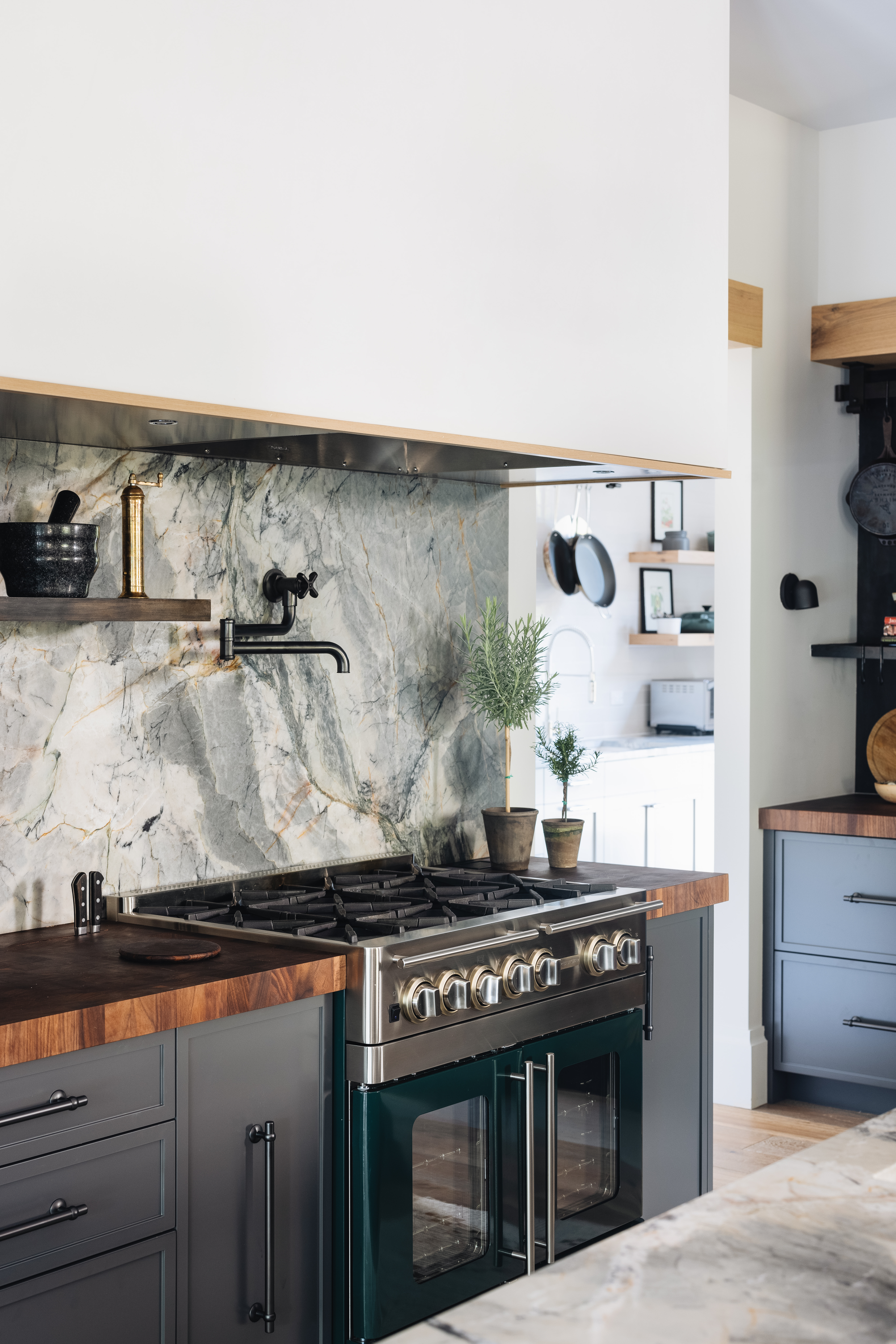 Their design inspiration included Scottish golf courses, Blackberry Farm, and traditional open-hearth cooking. Here, the kitchen is the heart of the home, and its workhorse, outfitted with a wood-burning oven, dining room slash cocktail bar, and a prep kitchen.